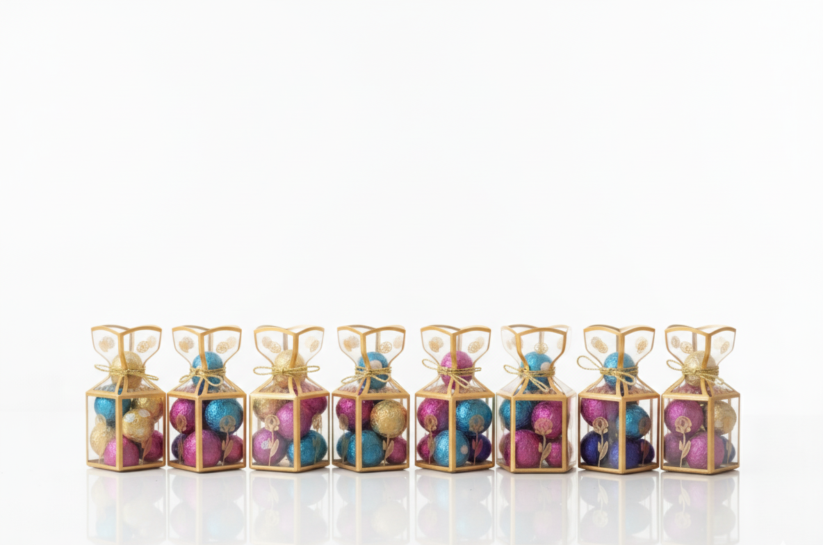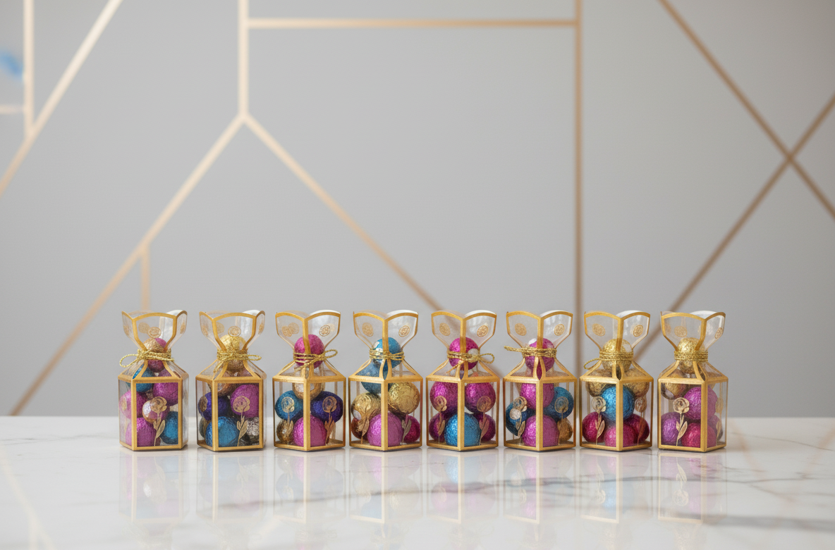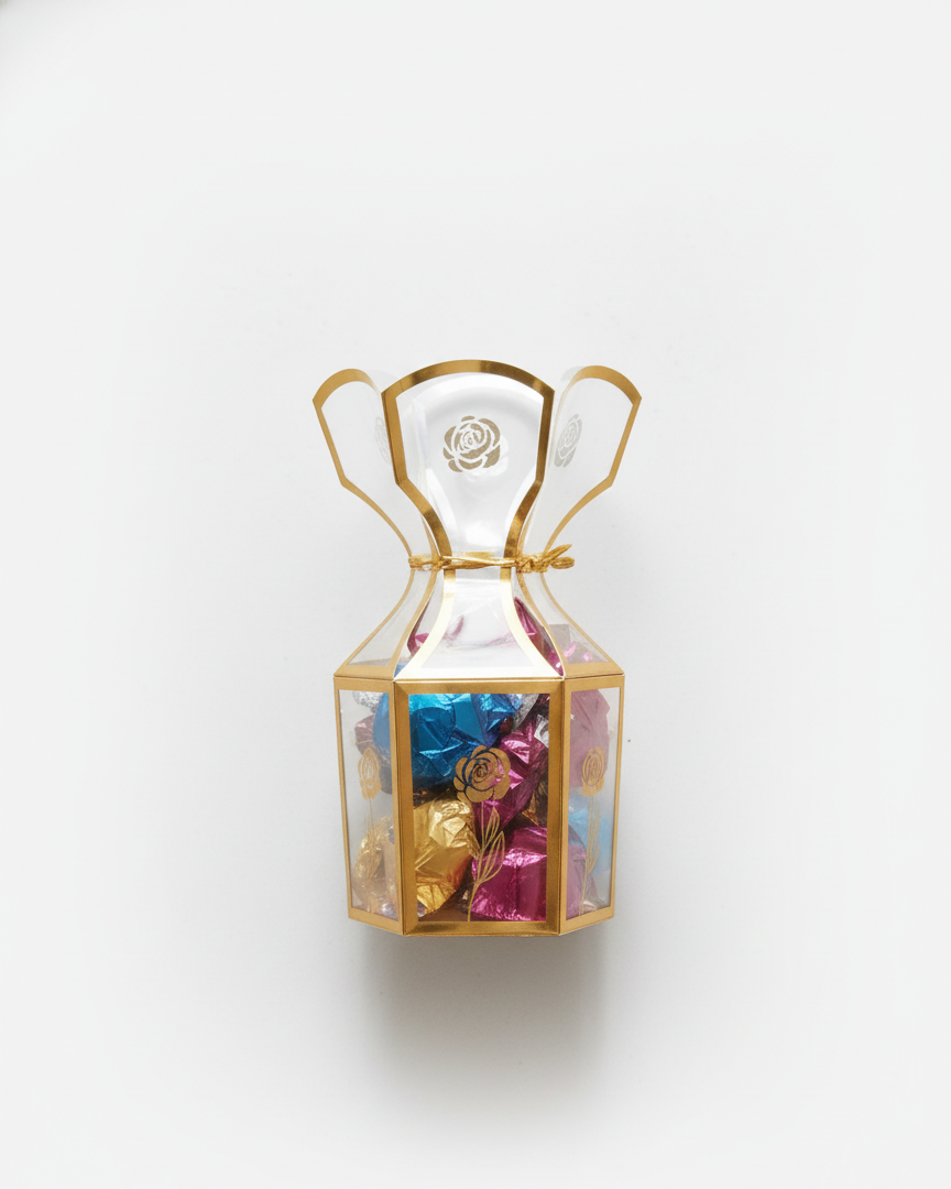 Elevate any occasion with this stunning, pre-packaged chocolate gift box. Featuring a shimmering gold-accented clear lantern design, this elegant presentation box is filled with a delicious assortment of foil-wrapped chocolates in vibrant colors (blue, pink, gold). It’s the perfect hassle-free gift for birthdays, anniversaries, holidays, or a thoughtful ‘thank you’ present that is ready to impress right out of the box.